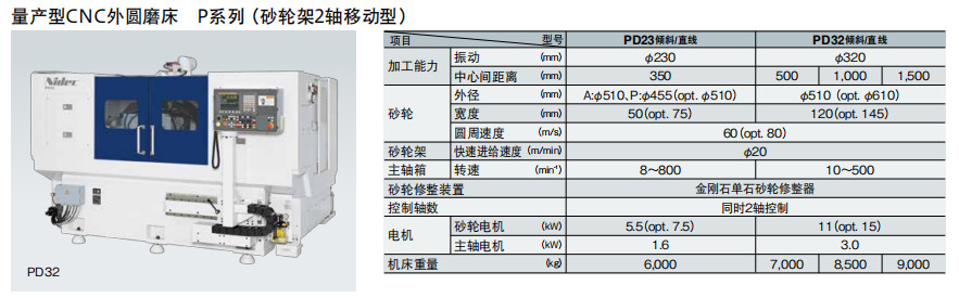 · 砂輪圓周速度 60 m/s(可選 80 m/s,PD32)的高速重磨削:砂輪軸標配11kW高輸出電機,標準規格為砂輪圓周速度60m/s、砂輪寬度120mm(可選最大145mm),可實現寬砂輪的高速單次重磨削。(PD32)(PD32)