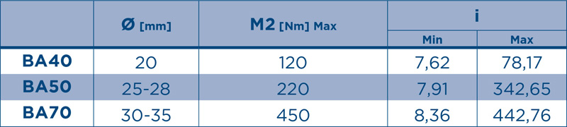 可用版本:BA - 適用于電動機聯軸節,IBA - 自帶輸入軸,CBA - 自帶緊湊型電動機